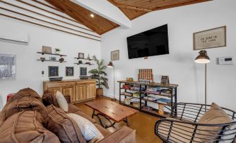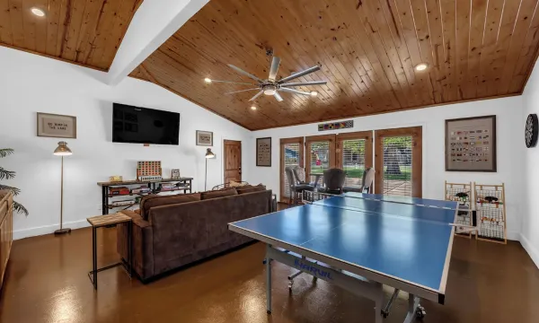 LOCATED AT THE BACK OF THE HOUSE IS A FUN GAME ROOM WITH A LARGE TV, PING PONG TABLE, DART BOARD, TONS OF BOARD GAMES, CARDS AND A LARGE REFRIGERATOR.