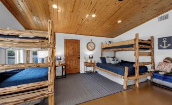 THE BUNK ROOM HAS A QUEEN SIZE MATTRESS, 3 TWIN SIZE MATTRESSES, A QUEEN SLEEPER SOFA, AND AN EXTRA QUEEN MATTRESS UNDER ONE BUNK & AN EXTRA TWIN MATTRESS LOCATED UNDERNEATH OTHER BUNK BED. WE HAVE A LARGE SMART TV FOR THE KIDS TO WATCH THEIR FAVORITE SHOWS OR MOVIES ON.
