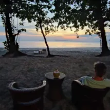 Отель находится рядом с пирсом, от отеля трансфер организован. Бунгало расположены очень удобно, отдыхающие не видят друг друга, но могут любоваться прелестями сада. У нас был улучшенный номер с видом на бассейн. Приятно было засыпать под шум волн. Завтраки сытные, есть фрукты. На углу главной улицы есть прекрасное кафе с вкусным кофе, десертами и большими разнообразными блюдами.Мы брали байк и объехали весь остров. Наш пляж самый лучший. Никогда не забуду эти безлюдные прогулки вдоль моря, очень расслабляет.