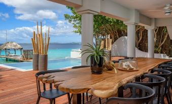 A brand-new oceanfront villa close to the city center of Bonaire. Villa Seru di Santu is the perfect accommodation for two families or a group of friends. The Villa consists of two floors with a private entrance. Each floor benefits from a well-equipped open kitchen, dining and living space with an amazing view over the calm Caribbean Sea. On both floors a total of six people can be accommodated and features three king-size bedrooms. The bedrooms all have their own private en-suite bathrooms and views of the surrounding area. All rooms are equipped with bed linen and towels and an adjustable air conditioning system. The Villa is surrounded by a beautiful tropical garden with a lounging space and a big dining table next to the pool area. This is the infinity pool blends perfectly together with the ocean and provides the perfect way to cool off when it gets too hot. The two stairs next to the pool give you a refreshing swim in the ocean. The villa also features the possibility of a scuba gear, an outside sun bed with an ocean view and a big sun bed to relax.
