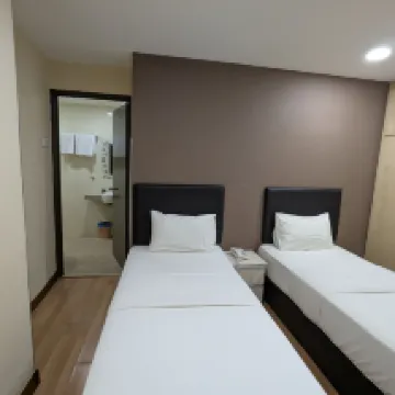 兩張單人床, 房間不大,入住需付100元馬幣押金,退房會退回,附近很熱鬧所以會有點吵,早餐只有一種每天都一樣,冷氣會漏水,浴室非常非常的小,房卡只給一張不願意多給