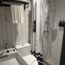 这家酒店散发着独特的复古气息,个性十足!前台工作人员非常友好热情,乐于助人。大堂看起来棒极了,既时尚又充满个性。 房间的设计和配色(白色、绿色、深色木质家具以及黑白瓷砖)都非常漂亮,我很喜欢!房间里有智能电视、迷你冰箱,浴室布局也很合理。淋浴区略显狭窄,但洗手池区域大小合适,而且有浴帘可以防止水溅出来。 酒店还提供洗发水、沐浴露、一次性剃须刀、牙刷和浴帽等必需品。床单、被子和毛巾闻起来都很清新,摸起来柔软舒适。 唯一的小缺点是枕头对我来说有点太软太扁了,所以花了一段时间才入睡。 总的来说,这是一次非常愉快的住宿体验。温馨舒适,时尚雅致,设计周到。强烈推荐!
