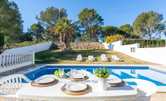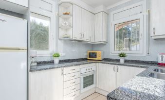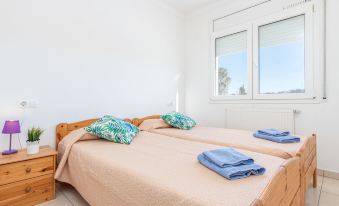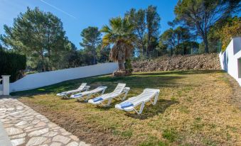 Camp Rabassa: House " Villa Marc", 2 storeys. In the resort 2 km from the centre of L'Escala, excellent location: right in the centre but still quiet, 700 m from the sea, 700 m from the beach. Private: garden (fenced) wildlife garden and flowers, swimming pool angular (4 x 8 m, depth 120 - 200 cm, seasonal availability: 01.Apr. - 31.Oct.) with internal staircase. Outdoor shower. Stepped path (13 steps) to the house. Parking at the house, single garage. Grocery, supermarket, shopping centre, restaurant, bar 700 m, bus stop 4 km, sandy beach "Platja de Riells", diving center 1 km. Sports harbour 1 km. Nearby attractions: Ruinas greco-romanas d'Empuries 3.7 km, Museo Dalí Figueres 26 km, Parque acuatico Aquabrava de Roses 27 km, Skydive Empuriabrava 23 km, Casino-Festival de Perelada 30 km, Pitch and Putt Gualta - 18 hoyos 15 km. Groups of teenagers on request only. 4-room house 100 m2 on 2 levels, on the upper floor. Comfortable furnishings: living/dining room with open-hearth fireplace (only for decoration), satellite TV and international TV channels (flat screen). Exit to the patio. 3 rooms, each room with 2 beds (90 cm, length 200 cm). Open kitchen (oven, dishwasher, 4 ceramic glass hob hotplates, microwave, electric coffee machine). Bath/WC, bath/shower/WC. Oil heating. Terrace furniture, barbecue, deck chairs (5). Beautiful view of the swimming pool and the garden. Facilities: washing machine. Internet (WiFi, free). Garage. Please note: maximum 1 pet/ dog allowed. TV only ES, DE, FR. HUTG014822 // Reg. Nr.: ESFCTU000017010000306149000000000000000000HUTG0148221