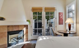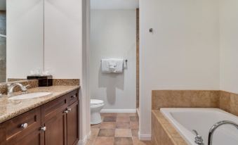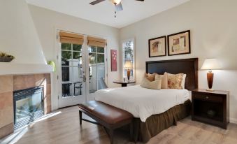 This gorgeous Studio lock off villa is outfitted with beautiful upgraded flooring throughout. The bedroom has a queen bed, cozy fireplace, smart TV, and ample closet space. The spacious en-suite bathroom has a large soaking tub and walk in shower. There is a kitchenette area fully stocked with a mini fridge, microwave, Keurig coffee maker, drip coffee maker, and dishes/silverware. The private patio overlooks the beautiful community grounds.