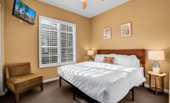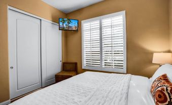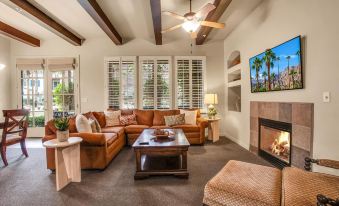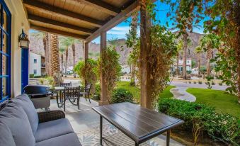 This 1BR/1BA lock off villa includes a spacious living room with cozy sectional sofa, Smart TV and fireplace. The kitchen includes all appliances and cooking necessities to make your weekend getaway or extended stay comfortable. Open the French doors off of the dining room to unobstructed views of the Santa Rosa Mountains and enjoy the tranquil sound of a fountain just steps away. The bedroom includes an upgraded King size mattress and Smart tv. A Keurig coffee maker and Keurig pods are provided, however there is also a standard drip coffee maker if preferred. An electric grill is available for guest use so you may BBQ on the back patio while taking in the beautiful scenery. Enjoy the tranquility and spectacular views that set this Villa apart from all of the rest!