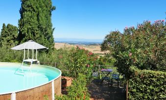 Country house "Castagni", 313 m a.s.l., surrounded by trees and fields. 2 houses in the residence. 2 apartments in the residence. Property composed of main house and outbuilding 20 m from the centre of Orciatico, on the outskirts, 17 km from the centre of Volterra, 60 km from the centre of Pisa. For shared use: terraced garden with trees, natural garden, orchard, swimming pool (above ground) (6 x 5 m, seasonal availability: 02.May. - 03.Oct.). Barbecue. In the house: washing machine (for shared use). Grocery 20 m, supermarket 15 km, restaurant 4.5 km, bus stop 50 m, sandy beach "Cecina Mare" 45 km. "Castagni II (OCT101)", 5-room house 170 m2 on 2 levels. Practical and rustic furnishings: living/sleeping room with 2 sofabeds and satellite TV. Open small dining room with open-hearth fireplace and dining table. Exit to the terrace. Small kitchen (4 hot plates, oven, toaster, freezer, electric coffee machine). Shower/WC. Upper floor: 3 rooms, each room with 2 beds (80 cm). Bath/bidet/WC. Gas heating. Terrace roofed. Terrace furniture. Beautiful view of the countryside. Facilities: baby cot. Internet (WiFi, extra). Parking. Please note: non-smokers only. Maximum 1 pet/ dog allowed. IT050016C2JL28493S