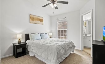 The Master Suite features a Queen-sized bed, closet, nightstands, and a single vanity sink with tub/shower combo.