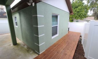 Conveniently located right across the street from Bonnet Springs Park, and only 5 minutes to I-4 and close to downtown Lakeland, enjoy your vacation in our quietly tucked away Studio Unit. This cozy unit has its own private exterior entrance with designated parking. It is decorated to perfection capturing Florida's beautiful beach style. Property is furnished with a comfy Full-size bed, dinner table for 2 and full kitchen equipped with a 30in refrigerator, microwave, dishwasher and range. Enjoy fully stocked utensils, dinnerware, pots, and a Keurig coffee maker with some k-cups. This will quickly become your home away from home. This unit has spacious closets stocked with an iron, hangers and towels (2 towels per guest). You will be able to swiftly connect to our smart TV to enjoy your favorite shows or connect for remote work. Property is also equipped with central AC, a ceiling fan and USB plugs and now a washer/dryer unit on property. Don't hesitate and book today!