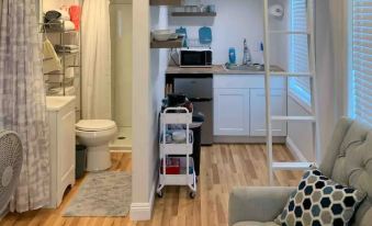 Our tiny house includes a small kitchenette with a mini refrigerator, microwave, sink for washing dishes, toaster, coffee machine, cups, plates, utensils and bbq supplies. THERE IS NO STOVE OR FREEZER! The bathroom is stocked with a toilet, shower, sink and medicine cabinet. Shampoo, conditioner, body wash is available as well as hand soap and fresh towels. This tiny house is a “bunkhouse” style meaning the queen mattress is located over the kitchen and bathroom. You must be able to climb a ladder to get to this bed. There is a trundle bed on the ground level in the living room. Enjoy TV with free streaming services of Netflix. Please choose “guest” account. To access other streaming services, please log into your personal accounts. Our tiny home does have a portable air conditioning unit that will be turned on prior to your arrival. Private parking on the property will always be available. No need to park on the streets.