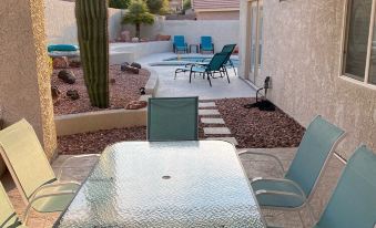 This house has everything you need or want. They've thought of everything. Super-comfortable beds, sofa. Very clean. The pool is fantastic, inviting, refreshing. In a very nice, safe neighborhood. I frequently went out running and walking in the area. Close to shopping and groceries but in a quiet residential neighborhood. Short drive to the airport and The *****. We stayed here just over two months. Everyone said don't go to Las Vegas in the summer, but they were wrong because the back patio in the shade and the pool made it so nice. We could drink our coffee out on the patio in the morning and sit out there most of the day in the shade and taking dips in the pool. The landscaping is beautiful. Owner is very responsive but not intrusive.We would definitely stay here again. We didn't want to leave.