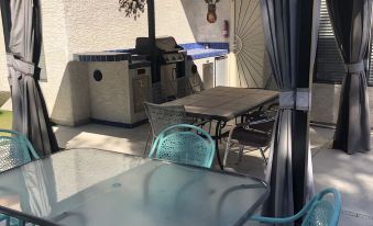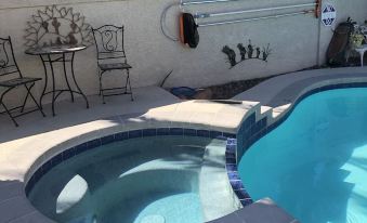 FANTASTIC single level/ Bungalow/Ranch style mostly SOLAR powered home. Child safety fence between HOUSE PATIOS & POOL & SPA/HOT TUB. Fast internet, bring your streaming devices. 9 HOLE MINI Pitch & Putt course in the yard, artificial GREENS & Grass. WILD HORSE Golf course (Public) across Warm springs Road( very nice course). Corner babbling brook fountain, GIANT PALM TREES, 3 bedrooms with KING size Master & ENSUTE. 2 QUEEN size beds, pull up bed & couch. DINING/POKER ROOM. Stocked Kitchen with BREAKFAST EATING BAR, GRANITE COUNTER TOPS, EATING NOOK viewing to the yard & fountain. OUTSIDE BBQ, Mini bar fridge, PATIO's with tables for eating & covered GAZIBO, very RELAXING. Super location & private setting large Yard. Double car garage for indoor parking. close to Las Vegas Strip & Airport. Cool weather POOL Heat is $100/day available for Autum, Winter & Spring Heating to 82 -85 degrees +-. Spa Heat is also available , no extra charge. SHORT TERM VACATION RENTAL CITY OF HENDERSON. STVR REGISTRATION NUMBER: STR19-00118, 2024 registration: STR19-00079About pets:Pets allowed: dogs less than 50 lbs per pet (limit 3 pets total).About checkOut:Check out before 11:00 AM.About children:Children allowed: ages 0-17.About customRules:no outdoor noise after 10pm.respect for the Nieghbors. No parties! No cats, non Shedding dogs ok..About checkIn:Check in after 3:00 PM.About smoking:Smoking is not permitted.About minBookingAge:Minimum age to rent: 25.About events:No events allowed.