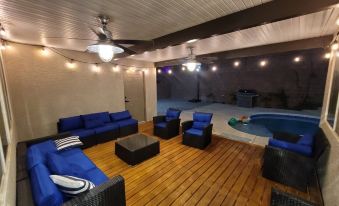 Beautifully updated luxury home to spend your down time with friends and family! The home features two master bedrooms, one downstairs and one upstairs each with 75" tvs and king size beds! Two additional bedrooms with queen beds and 55" tvs. This home features a large backyard with a private pool and spa. The chefs kitchen is fully equipped with built in 48 inch stove , and 42 inch fridge everything needed to whip up a quick meal or you are minutes away for many local restaurants! This will be your home away from home! License STR20-00104About pets:Pets allowed: less than 20 lbs per pet (limit 2 pets total).$75 per pet fee..About checkOut:Check out before 10:00 AM.About children:Children allowed: ages 0-17.About customRules:NO parties or gatherings of any kind due to the city ordinances. quiet hours 10pm-8am $75 per day to heat pool when temps are below 70 degrees..No Large speakers allowed; owner stores a vacant RV on the side of the home.,NO DISTURBING THE NEIGHBORS! NO EXCEPTIONS! City or neighbor complaints will result in immediate cancellation of your reservation, without refund.About checkIn:Check in after 3:00 PM.About smoking:Smoking allowed: in designated areas.Outside only.About minBookingAge:Minimum age to rent: 18.About events:No events allowed.