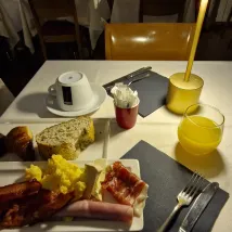 接待員非常友善,樂於助人。 可惜我們的房間位於市中心,從窗戶只能看到樓梯。 看不到海景。 此外,雖然只有在聖米歇爾山才能欣賞到海景,但這裡沒有電梯,所以拖著行李箱真的很麻煩。最好盡量輕裝出遊。 早餐的羊角麵包新鮮出爐,美味可口。 其他早餐都說不上好,也說不上壞。