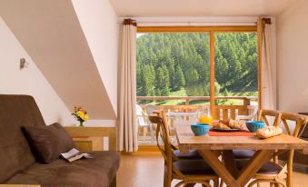 Residence "Parc des Airelles". In the hamlet Bois Méan, directly by the skiing area. In the complex: reception, WiFi, sauna, spa area in 50 m for shared use, central heating system. Bread roll service possible (extra). Roofed, parking (extra). Shop 50 m, supermarket 500 m, restaurant 50 m. Ski lift 20 m. Please note: the photograph shows a typical example. "Parc des Airelles", 1-room apartment 26 to 30 m2. Bright, beautiful furnishings: living/sleeping room with 2 sleeping facilities, dining table and TV can be hired. Alcove with 2 sleeping facilities. Open kitchen (dishwasher, 2 ceramic glass hob hotplates, toaster, kettle, microwave, electric coffee machine). Sep. WC, bath or shower. Balcony or terrace. Marvellous view of the ski run. Please note: non-smokers only. Maximum 2 pets/ dogs allowed. The property is one of a type of property or apartment. Instead of an enclosed bedroom, some sleeping areas are located in an open-plan area (gallery, alcove, etc.).