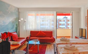Locarno: Large, comfortable apartment block "Residenza Lido", 6 storeys, surrounded by trees and meadows. On the outskirts, 1.8 km from the centre of Piazza Grande, in a sunny position, excellent location: right in the centre but still quiet, 50 m from the lake, in the countryside. In the house: reception, lounge, lift, roof terrace, central heating system. Motor access to the house. Public parking 100 m on the road extra. Shop 1.1 km, grocery 1.1 km, restaurant, café 80 m, 15 minute walk to the centre, bus stop "Linie 3 + 4" 50 m, railway station "Locarno SBB-CFF" 3 km, outdoor swimming pool, indoor swimming pool 50 m, thermal baths "Termali & Salini" 80 m, public bathing area 50 m. Golf course (18 hole) 6 km, tennis 400 m, minigolf 2 km, walking paths from the house 50 m. Well-known lakes can easily be reached: Lago Maggiore, Lago di Lugano, Lago di Como. Hiking paths: Cardada, Monte Verità, Centovalli, Vallemaggia, Valle Onsernone, Valle Verzasca. Please note: not suitable for small children. Not suitable for children under 14 years. The keys‘ handover takes place by the agency Interhome in Locarno (1km). Property ref. CH6600.410 is situated on the same property. "Residenza Lido Appartment 501", 1-room apartment 50 m2 on 5th floor, south-west facing position. Spacious and bright, modern and cosy furnishings: open living/dining room with 2 fold-away beds (90 cm, length 200 cm), dining table, cable TV, flat screen and radio. Exit to the balcony. Small kitchen (3 hot plates, oven, kettle, microwave, electric coffee machine). Bath/WC. Balcony 11 m2, west facing position and north facing position. Balcony furniture, deck chairs (2). Side view of the lake, the mountains and the countryside. Facilities: hair dryer. Internet (WiFi, free). Please note: non-smokers only. NL-00004437