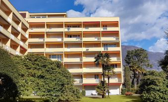 Locarno: Large, comfortable apartment block "Residenza Lido", 6 storeys, surrounded by trees and meadows. On the outskirts, 1.8 km from the centre of Piazza Grande, in a sunny position, excellent location: right in the centre but still quiet, 50 m from the lake, in the countryside. In the house: reception, lounge, lift, roof terrace, central heating system. Motor access to the house. Public parking 100 m on the road extra. Shop 1.1 km, grocery 1.1 km, restaurant, café 80 m, 15 minute walk to the centre, bus stop "Linie 3 + 4" 50 m, railway station "Locarno SBB-CFF" 3 km, outdoor swimming pool, indoor swimming pool 50 m, thermal baths "Termali & Salini" 80 m, public bathing area 50 m. Golf course (18 hole) 6 km, tennis 400 m, minigolf 2 km, walking paths from the house 50 m. Well-known lakes can easily be reached: Lago Maggiore, Lago di Lugano, Lago di Como. Hiking paths: Cardada, Monte Verità, Centovalli, Vallemaggia, Valle Onsernone, Valle Verzasca. Please note: not suitable for small children. Not suitable for children under 14 years. The keys‘ handover takes place by the agency Interhome in Locarno (1km). Property ref. CH6600.410 is situated on the same property. "Residenza Lido Appartment 008", 1-room apartment 30 m2, on the ground floor, south-west facing position. Bright, practical and cosy furnishings: open small living/dining room with 2 fold-away beds (90 cm, length 200 cm), dining table, cable TV and flat screen. Exit to the patio. Small kitchen (2 ceramic glass hob hotplates, kettle, microwave, electric coffee machine, Capsules for coffee machine (Delizio (Migros)) extra, raclette grill, fondue Set (cheese)). Shower/WC. Heating. Patio partly roofed. Terrace furniture, deck chairs (1). Beautiful view of the garden. Please note: non-smokers only. NL-00005802