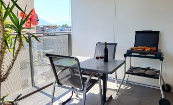 Locarno: Large, comfortable apartment block "Torre Tessuti 3", 200 m a.s.l., 9 storeys. In the centre of Locarno, in a sunny position, in the heart of the city. In the house: lift, central heating system. Motor access to the house. Communal covered parking at the house. Shop, grocery 50 m, supermarket, restaurant 50 m, bar, bakery 50 m, café, pedestrian zone 500 m, bicycle rental 50 m, 5 minute walk to the centre, bus stop "Migros Linie 4", railway station "SBB-CFF Locarno" 1.2 km, outdoor swimming pool 1.1 km, indoor swimming pool 1.1 km, thermal baths "Termali Salini & Spa" 1 km, lake Lungolago di Locarno 650 m. Marina 300 m, golf course (18 hole) 3 km, tennis 300 m, minigolf 130 m, sports centre 300 m. Nearby attractions: Falconeria Locarno, Piazza Grande, Madonna del Sasso, Orselina, Castelli di Bellinzona UNESCO, Ponte Tibetano, Monte Carasco, Mercato Luino (IT), Mercato Canobbio(IT). Well-known lakes can easily be reached: Lago Maggiore, Lago di Lugano, Lago di Como. Hiking paths: Carcada, Centovalli, Valle Verzasca, Monte Tamaro, Splash & Spa - Monte Lema, Monte Bré, Monte Generoso. The keys‘ handover takes place by the agency INTERHOME in Locarno, 100m. "Torre Tessuti Apt.Stefano", 2-room apartment 50 m2 on 6th floor. Object suitable for 2 adults + 2 children. Bright, comfortable and modern furnishings: open living/dining room with 2 sofabeds (100 cm, length 190 cm), dining table. Exit to the balcony. 1 double bedroom with 1 french bed (160 cm, length 200 cm), bath/WC. Exit to the balcony. Open kitchen (oven, dishwasher, 4 ceramic glass hob hotplates, kettle, electric coffee machine, Capsules for coffee machine (Nespresso mitbringen) extra). Sep. WC. Underfloor heating. Natural stone floors. Small balcony, south facing position, small balcony, north facing position. Balcony furniture, electric barbecue. Beautiful view of the mountains and the resort. Facilities: children's high chair, baby cot for up to 2 year olds (extra), hair dryer. Internet (WiFi, free). Parking space n 84 / 364, Tiefgarage (extra). Please note: non-smokers only. Maximum 1 pet/ dog allowed. NL-00002215