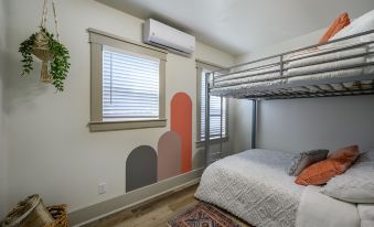 The interior space is decked out with a full size memory foam bunk bed (2 beds) in the first room; one queen size memory foam bed w/ optional baby playpen, a work desk and flat screen smart TV in the second room; and a queen size Article sofa bed in the living room. The optimal number of guests is 6 but we can accommodate more of the little ones if they’re willing to pile up ;)