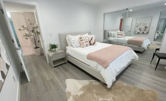 With 3 bedrooms offering a king, 2 twins, and a queen bed, you will have plenty of space to relax. The large living room and family room spaces both feature large smart TVs with premium subscriptions available, as does the primary bedroom. The 2.5 bathrooms are equipped with amenities you would expect such as a hair dryer, and natural hair and body products. Also, enjoy the convenience of central air and heat, laundry facilities, high speed WiFi, and upgraded furnishings during your stay.