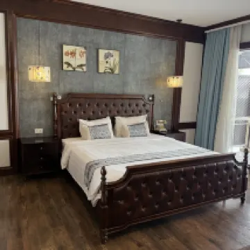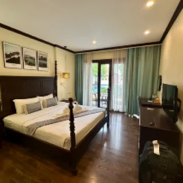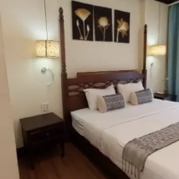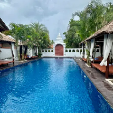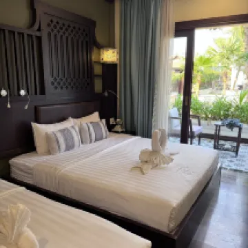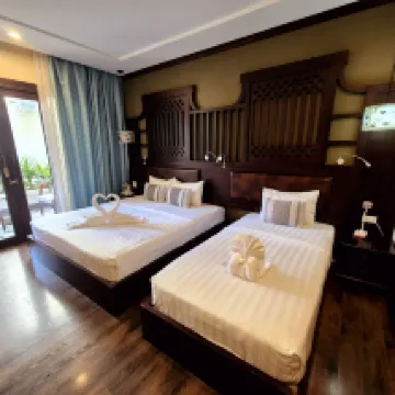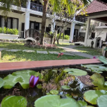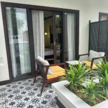 The hotel was lovely, conveniently located near the night market and restaurants, yet tucked away from the main road. The rooms were spacious, clean, and boasted comfortable beds. Breakfast offered a good selection of high-quality items. A welcome drink and fruit were provided upon arrival. The staff were very helpful, providing us with information about local attractions, and we easily rented a moped from the hotel for 180k. The pool area was pleasant, though mostly shaded. Some noise from the main garden area was audible through gaps in the doors, but the hotel was generally quiet, so it wasn't a significant issue.