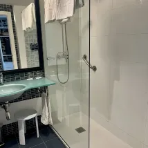 在浴缸裡淋浴不太方便;沒有浴簾擋水,只有一塊可以稍微遮擋水的滑動玻璃板。注意不要讓水直接對著玻璃,否則水會流出來。