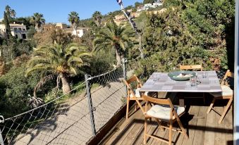 Our Casita features a deck overlooking the palm trees and greenery of the valley leading to the bay, a shaded deck behind the house with a built-in grill, as well as a large, sunny roof terrasse. Inside a fully equipped kitchen invites the family around a large kitchen table, a sitting area for relaxation, TV watching or playing games, a master bedroog with a king-size bed and a 2nd bedroom with two beds.