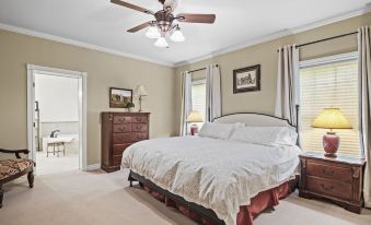 The six bedrooms all have new carpet and new Sealy Posturepedic mattresses (2021) with special mattress pads for extra comfort. The master bedroom (king bed) and one secondary bedroom (queen bed) are on the main floor; the other four bedrooms (3 king and 1 queen) are on the second floor. Master bedroom has large walk-in closet and bath, perfect for preparing for special occasions. All bedrooms have bathrooms and closet storage. Designed for 12 adults, home can accommodate up to 14 with sofa bed in basement den. There is a full bath in the basement.