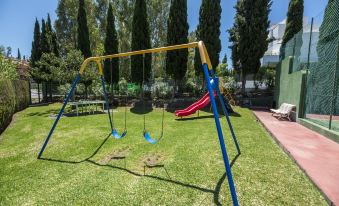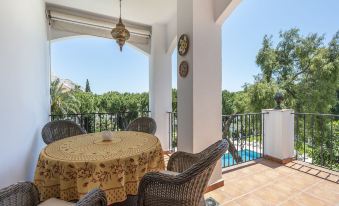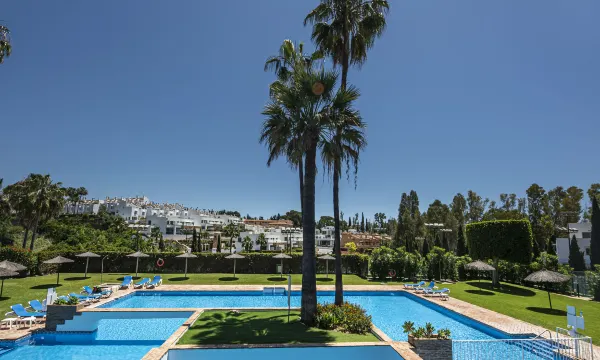 Beautiful, luxurious apartment block "Senorio de Marbella". In the district Golden Mile, 1.2 km from the sea, 1.2 km from the beach. For shared use: park, beautiful garden to relax, courtyard, pond, 4 swimming pools heated (seasonal availability: 01.Jan. - 31.Dec.) with internal staircase. Shower/WC in the pool area, children's pool, tennis, children's playground, planted inner courtyard communal covered parking space n 30 public parking on the road. Parking space or garage only for small to medium-sized cars. Supermarket 2 km, restaurant 100 m, pedestrian zone, pub garden 600 m, bus stop "Hotel Puente Romano" 900 m, sandy beach "Nagüeles" 1.2 km. Sports harbour 3.5 km, golf course (18 hole) 4 km. 24hr guard. Neighbourhood highly sensitive to noise. Quietness and good behaviour expected. Designed in the style of an Andalusian village with tropical gardens, waterfalls and trails. It has four swimming pools, one of which is heated, two tennis courts and two paddle tennis courts, a children's playground and a restaurant. "Las Ranas", 3-room apartment 94 m2 on 2nd floor. Comfortable and beautiful furnishings: living room with digital TV. Exit to the terrace. 1 room with 2 beds (90 cm, length 190 cm). 1 room with 1 french bed (150 cm, length 190 cm), shower/WC (private). Open kitchen (oven, dishwasher, 3 induction hot plates, toaster, kettle, microwave, freezer, electric coffee machine, Capsules for coffee machine (Nespresso) free) with bar. Shower/WC. Air-conditioning, forced-air heating. Terrace 12 m2. Terrace furniture. View of the swimming pool and the garden. Facilities: washing machine, dryer, iron, children's high chair, baby cot, hair dryer. Internet (WiFi, free). Garage space n 30. Please note: non-smokers only. No lift. VUT/MA/44266