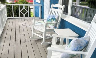 The second floor offers two pretty bedrooms, one holds a queen bed and the other has two twin beds, comfortable for adults as well as children. A second full bath on this floor has a tub with shower.