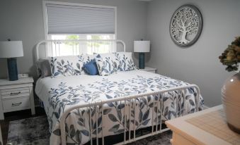 Also on the first floor is a serene bedroom with a king bed, nightstands with USB ports and TV.