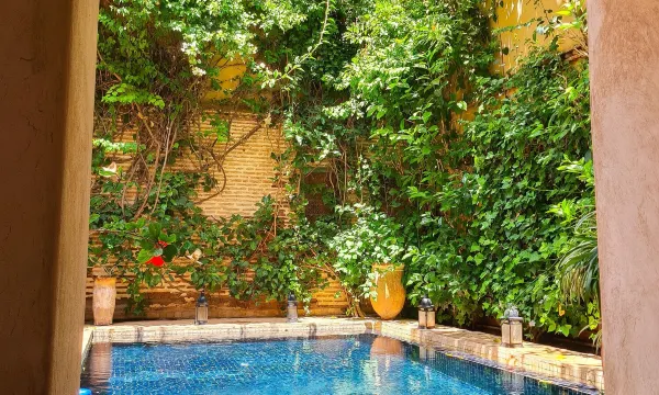 環境位置: 酒店位於馬拉喀什的中心地帶,距離繁忙的市中心僅需短暫步行,讓客人能夠輕鬆享受城市的魅力,而同時保持距離以享受平靜的氛圍。這座建築擁有200多年的歷史,是一座真正的宮殿,其古老而優雅的外觀令人驚嘆。酒店周圍被郁郁蔥蔥的植物和花卉環繞,提供了一個寧靜的避風港。屋頂露台提供壯觀的城市和山脈景色,讓客人能在享受餐點或閱讀時沉浸於周圍的美景。