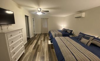 As you enter the open-concept layout, you'll find a fully furnished kitchen complete with a kitchen table seating six, plus two stools at the island. The living room features a 70" smart TV for your enjoyment. A half bath. Two large bedrooms with attached bathrooms are located downstairs, with the master bedroom boasting a custom shower. Upstairs, there are two spacious bedrooms—one with 4 full-size beds and the other with two king-size beds. Each room has its own bathroom. The balcony upstairs is an ideal spot for reading or sitting at the bar playing board games. All four bedrooms are equipped with smart TVs. Additionally, each bedroom has its own Mitsubishi wall-mounted air conditioning unit, allowing guests to control the temperature to their liking.