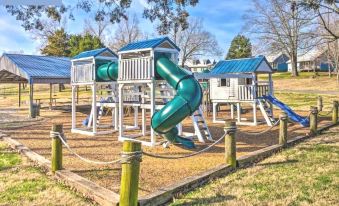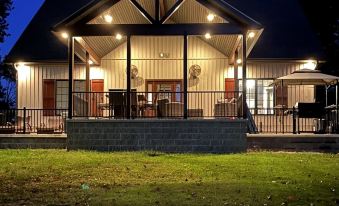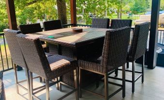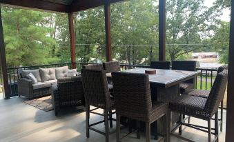 Experience the splendor of Kentucky Lake at The Chateau Relaxo, specifically designed to provide comfort, luxury, and outdoor entertainment for multiple families and groups of friends. The house features a magnificent large porch with a dining table and seating for eight. It is furnished with a cozy couch, two chairs, and a coffee table. To enhance your comfort, two fans are mounted on the porch, ensuring a pleasant breeze. Additionally, there are two 11'x14' side patios—one equipped with a charcoal grill for outdoor cooking and the other adorned with two comfortable lounge chairs. We provide charcoal, and lighter fluid for your convenience. We offer complimentary firewood for the fire pit, conveniently stored in a wood holder near the house, perfect for enjoying a cozy fire or making delicious s'mores and hotdogs. Cornhole boards are also provided for your entertainment.