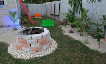 Take a plunge or a lazy float on one of our pool floats (air pump in laundry room) and enjoy the backyard Tiki Inspired quirky charm that helps you feel as though you are lost in a truly vacation state of mind. Large covered outdoor patio space with table and chairs, bench, smart TV and a complete hangout zone with Dartboard, Ring Toss, Large Jenga and Single Putting Green Game. Test your skills at Ladder Ball, Adult Sized Connect 4, Yard Chess, and Corn Hole anywhere around the spacious pool deck completed with more tables, chairs, and sun loungers to help you get that perfectly bronzed Florida tan. Looking for yet another area to eat or relax? Try the umbrella covered table and chairs next to the backyard Tiki Bar (not open yet). Short range Horseshoes are ready for a toss (game behind the shed) next to the firepit which comes with marshmallow sticks ready for you to make your smores dessert. Then hop on your pool float again as you gaze up at the twinkling night sky filled with bright stars and the chance of a Kennedy Space Center Launch sighting before you head in to watch the 55” Smart TV from the 3person leather sofa living room. There are many chairs and a rocking chair inside to move into the living room if you need more seating. Please just put anything you move back prior to checking out. Each of the bedrooms is equipped with it’s own smart TV.