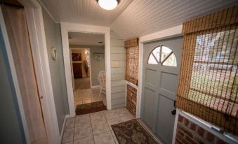 When you arrive, you will park in a designated grass area enough for two cars. You will walk the brick path to the side door. Inside is spacious with carriage style vaulted ceilings in the living room, a modern style kitchen, efficient bathroom with tub/shower combo and a relaxing bedroom with a comfy queen-size bed.