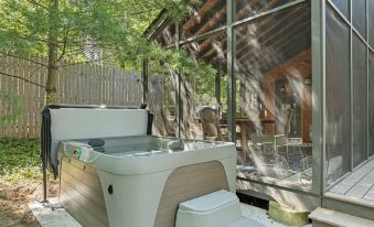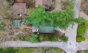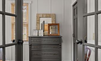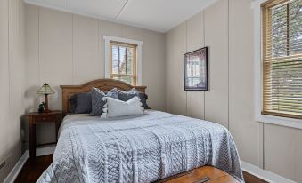 The fully equipped open galley kitchen is highlighted by top-of-the-line appliances, including a Bosch dishwasher, and cherrywood cabinets. Do we say "ooh-la-la"? Yep, we do! When you and your guests want to gather for a formal meal, there’s a sweet dining table out in the 3-season porch area where you can enjoy whatever marvelous meal gets prepared. Guests love the stained-glass window decor and artisan craftsmanship that’s on obvious display throughout the cottage, reminiscent of the work of Frank Lloyd Wright. Uh-huh, we think you’ll be tickled, too.