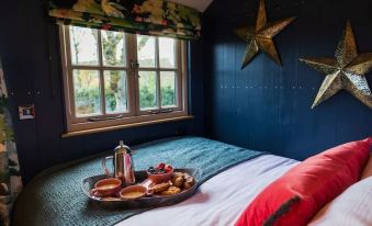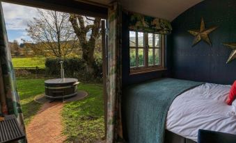 Situated beneath an old Elm tree this bespoke Shepherd's Hut is surrounded by wonderful views of Teesdale that can be enjoyed from the comfort of the hut, relaxing in the wood fired hot tub or sitting around the fire pit. This Hut encourages indulgence as well as simple living. Sumptuous interiors, good sized bathroom with a heated towel rail. A generous dining table and comfortable upholstered chairs. Fully equipped bijou kitchen, comfy king sized bed and electric heating for extra cosiness.