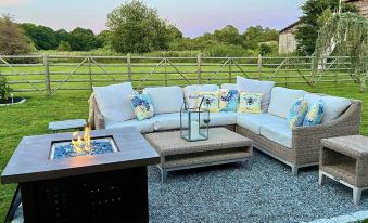 The king bed in the master bedroom was SUPER comfy. Loved the view of the fields out back from the bedrooms and windows by the kitchen table too. Then outside, we loved the table and chairs in the side yard, the quaint little table and chairs for two on the back porch, the 2 sunning chairs in the back corner, and the big comfy sectional in the back yard.