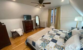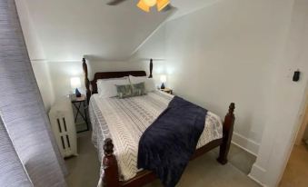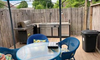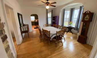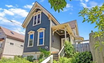 Enjoy coffee on the side porch or dinner grilled in the backyard. Each floor has a full bathroom. Two of the bathrooms have jetted tubs. The kitchen is well equipped with a dishwasher, gas stove, microwave, toaster, Keurig coffee maker and traditional coffee pot with bean grinder. We supply a variety of K-cup coffees, teas and hot chocolate. The lower level rec room has a electronic dart board, pinball machine, two smart tv's, four-top cocktail table, a couch and separate living room area with a pullout twin bed. The house has all the charm of an old Victorian, with 10 foot ceilings, slightly uneven hard wood floors and quirky staircases. The house is not childproofed (no covered outlets or secured furniture). There are 14 steps up to the front porch, stairs inside to go up to the bedrooms and down to the rec room, and 6 steps down the side porch to the parking pad.
