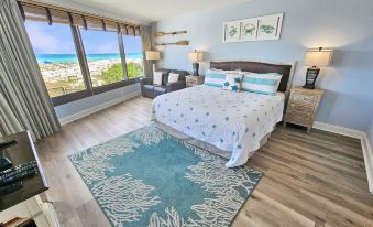 The master bedroom is spacious with a king sized bed and a wall of windows overlooking the beautiful Gulf of Mexico. Attached to the master bedroom is a full bathroom with double vanities and a walk in shower.