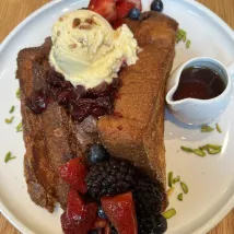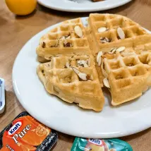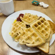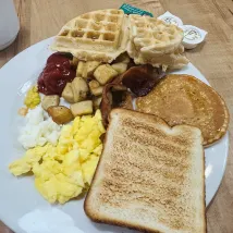 房間比較小,含的早餐雖然種類不多但完全能吃飽,在工作人員幫助下,還自製了個華夫餅🧇,好吃!第二天讓接駁車搭我們回機場租車的地方,出發去port hope看三文魚洄游啦~