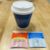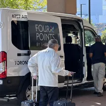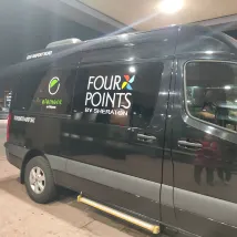 酒店接駁車在Terminal 1的E出口(出口有A到E),最邊上的柱子(寫着F3)。黑色車子,車身寫着Four Points。