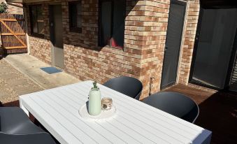 The private courtyard extends seamlessly from the dining area, catching the sea breeze and offering the perfect spot for outdoor meals or a quiet cuppa.