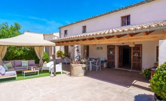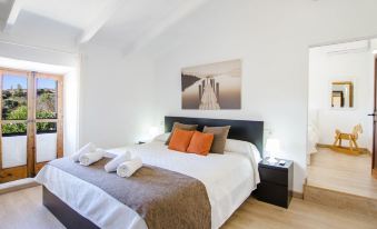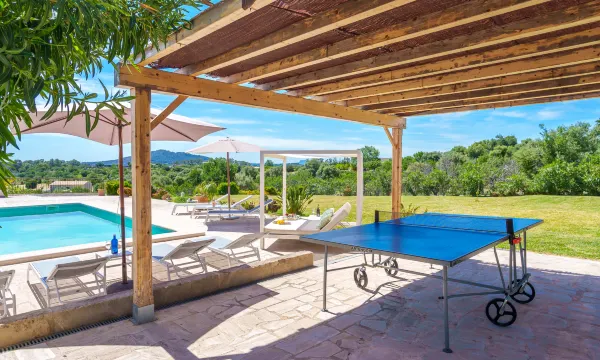 Moscari: Very large, very beautiful farm estate "Es Cos", 2 storeys, renovated, surrounded by trees. Outside the resort, 500 m from the centre of Moscari, in a quiet, sunny position, 2 km from the edge of the forest, 22 km from the sea, 22 km from the beach. Private: garden with lawn and wildlife garden, swimming pool angular (9 x 5 m, seasonal availability: 01.Jan. - 31.Dec.). Outdoor shower, table tennis, patio, arbour, pergola, garden furniture, barbecue. In the house: internet access, WiFi, table tennis, air conditioning, washing machine. Parking at the house on the premises. Grocery 900 m, supermarket 4 km, restaurant 900 m, bar, bakery 900 m, café, internet café, pedestrian zone, bicycle rental 4 km, pub garden 900 m, bus stop, sandy beach 22 km pebble beach 22 km, shingle beach 22 km. Sports harbour 25 km, marina 25 km, golf course (18 hole) 30 km, surf school 25 km, sailing school 40 km, tennis 4 km, riding stable 9 km, sports centre 9 km, cycle lane 3 km. Please note: suitable for families, suitable for seniors. Object suitable for 8 adults groups of teenagers on request only. Loading and unloading of baggage is possible at the holiday house. Main road close by. "Es Cos", 5-room villa 200 m2 on 2 levels. Object suitable for 8 adults. Spacious, fully renovated, very beautiful and tasteful furnishings: large living room with TV, satellite TV, flat screen, air conditioning and forced-air heating. Exit to the patio, to the swimming pool. 1 large double bedroom with panoramic window with 1 french bed, air conditioning and forced-air heating. Exit to the patio, to the swimming pool. Kitchen-/living room (oven, dishwasher, 3 ceramic glass hob hotplates, microwave, freezer, electric coffee machine, cooking island) with dining table, air conditioning and forced-air heating. Exit to the patio, to the swimming pool. Bath/shower/WC. Upper floor: (ladder), 1 large double bedroom with panoramic window with 1 french bed, air conditioning and forced-air heating. Exit to the balcony, to the terrace. (ladder), 1 double bedroom with panoramic window with 1 french bed. (ladder) walk-through room, large with panoramic window with 2 beds (90 cm), air conditioning and forced-air heating. Bath/shower/WC. Natural stone floors. Comfortable furnishings in the country house style. Large patio, lawn. Terrace furniture, balcony furniture, barbecue, deck chairs (8), covered balcony. Very beautiful view of the mountains and the countryside. Facilities: washing machine, iron, children's high chair, baby cot, hair dryer. Internet (WiFi, free). Parking at the house. Suitable for families. ETV7057