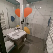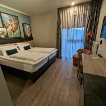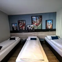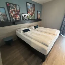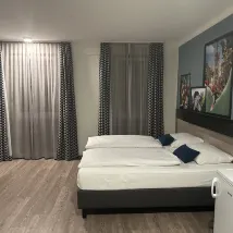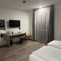 和同事展會期間入住,離展館一站地鐵路程,非常方便,走路到地鐵站旁邊也就差不多10分鐘。 訂的三床房,房間和床都比較小,床太軟了,腰不太好,想把床墊拿掉衹睡牀板,結果連牀板都是軟的。我們住的三人間的浴室和廁所是分開獨立的,這點比較好。 環境還算乾淨衞生,入住第一天有三瓶玻璃水的飲用水,結果擰開瓶蓋發現瓶子不是一次性的,估計裏面罐的是自來水,因為德國的自來水可以直飲,第一天水喝完後面兩天也沒有給我們換水。 早餐我覺得應該是屬於非常豐富的,我不大習慣西餐,不過也能找到合適的食物,火腿肉非常好吃,早上要早點去餐廳,最好6:30開門就去,可以慢悠悠的吃早餐,到8點後去非常擁擠,有時還要排隊。