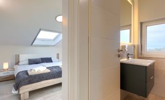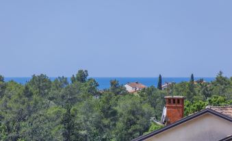Murine 3 km from Umag: Apartment house "Villa Galici", built in 2022. In the hamlet Galići 1 km from the centre of Murine, in a sunny position, 2.5 km from the sea, 2.5 km from the beach. For shared use: property 1'000 m2 with lawn, swimming pool angular heated (10 x 5 m, depth 150 cm, seasonal availability: 01.Jan. - 31.Dec.) with internal staircase and shutter cover. Outdoor shower. In the house: internet access, table football. Parking at the house on the premises. Shop 1.5 km, restaurant 800 m, bus stop 4.1 km, pebble beach 2.5 km, rocky beach 2.5 km. Walking paths from the house 100 m, cycle lane 150 m. The owner does not accept any youth groups. 3-room apartment 70 m2, on the top floor. Living/dining room with sloping ceilings, ceiling height 120 - 260 cm with rooflight with satellite TV and air conditioning. Exit to the terrace. 1 room with sloping ceilings, ceiling height 120 - 260 cm with rooflight with 1 double bed (2 x 90 cm, length 200 cm), satellite TV and air conditioning. 1 room with sloping ceilings, ceiling height 120 - 260 cm with rooflight with 1 double bed (2 x 90 cm, length 200 cm), shower/WC, satellite TV and air conditioning. Open kitchen (4 hot plates, oven, dishwasher, toaster, kettle, freezer, electric coffee machine). Shower/WC. Floor heating. Terrace 20 m2. Terrace furniture, barbecue (portable), deck chairs. Distant view of the sea. Facilities: washing machine, safe, baby cot, hair dryer. Internet (WiFi, free). Suitable for families.