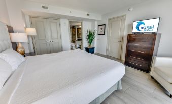 The King Suite comprises a private bedroom with a king-sized bed and an ensuite bathroom complete with a garden jetted tub. The second bedroom features two queen-sized beds. With accommodations for up to 8 guests, this beachfront condo promises a relaxing escape above the Atlantic Ocean.