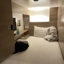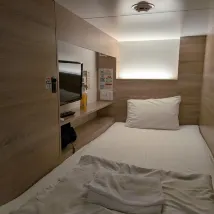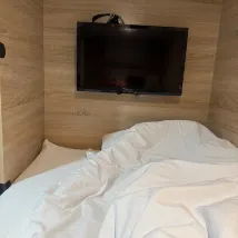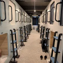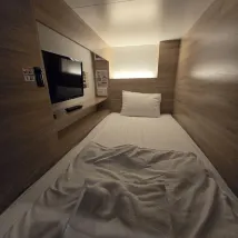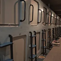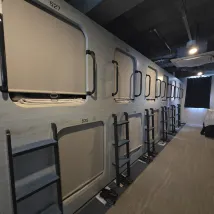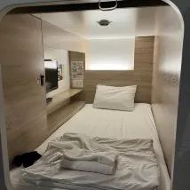 從單軌電車旭橋站步行幾分鐘就到了,地點我覺得還不錯。不過,因為不在主幹道上,晚上會比較暗,所以擔心這點的朋友還是要注意安全。不過,其實一點也不危險。 我住的是膠囊房間,膠囊裡的置物櫃非常方便,可以輕鬆存放衣物和貴重物品。 浴室很舒適,有一個很大的浴缸,足夠我舒展身體。我沒有用過,所以無法評價,不過那裡也有桑拿和冷水浴。 此外,一樓的休息區幾乎每個座位都有電源插座,而且軟性飲料是免費的,這點很貼心。 這家膠囊旅館我絕對想再住一次!