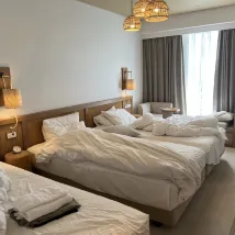 感謝您選擇我們的酒店並分享您的入住體驗! 我們很高興您對酒店的地理位置和安靜環境感到滿意。能夠為您提供一個舒適的休息空間是我們的目標。 特別感謝您提到的泡湯設施,我們相信這能為您的旅程增添不少放鬆的時光。同時,免費飲料的咖啡廳也是我們希望為客人提供的小驚喜。 關於房間的清潔安排,我們會繼續努力,確保為您提供乾淨舒適的環境。很高興您對房間的空間感到滿意,拼在一起的床也能讓您和家人享有更大的睡眠空間。 期待您再次光臨,祝您旅途愉快!