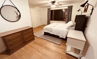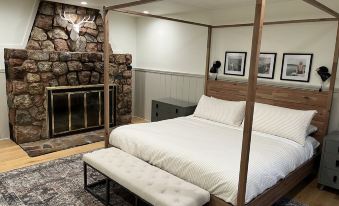 Hilltop 提供 4 間臥室和 3 間全套浴室(10 張床,最多可容納 10 位成人,總共可容納 10-14 人)。我們的主樓層圍繞一個巨大的壁爐而建,擁有一間帶一張特大號床的超大主臥和套內浴室。第二間臥室有一張特大號床,正對著壁爐,我們的全套客用浴室就在大廳對面。滑開穀倉門,找到我們的第三間臥室,它兼作書房/辦公室(無線網絡)。